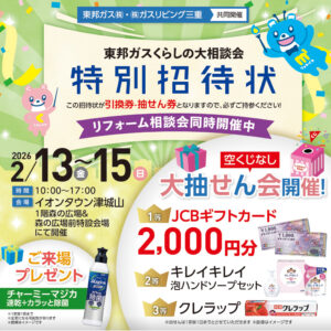 ご案内 【2月13日(金)14日(土)15日(日)】東邦ガスくらしの大相談会 会場 イオンタウン津城山 1階森の広場&森の広場前特設会場 〒514-1112 三重県津市久居小野辺町1130-7 開催日時 2月13日(金)~15日(日) 午前10時~午後5時