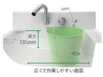 底面が広いので、バケツの水汲みや衣類のつけ置き洗いもしやすいです。排水口を右奥に配置しているので、作業の邪魔になりません。